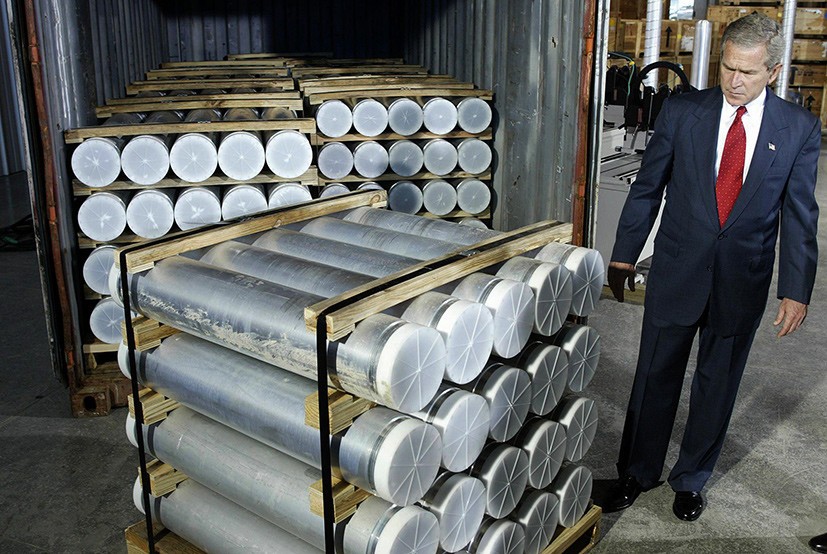 "Президент США Джордж Буш — младший инспектирует ядерные материалы, вывезенные из Ливии"
