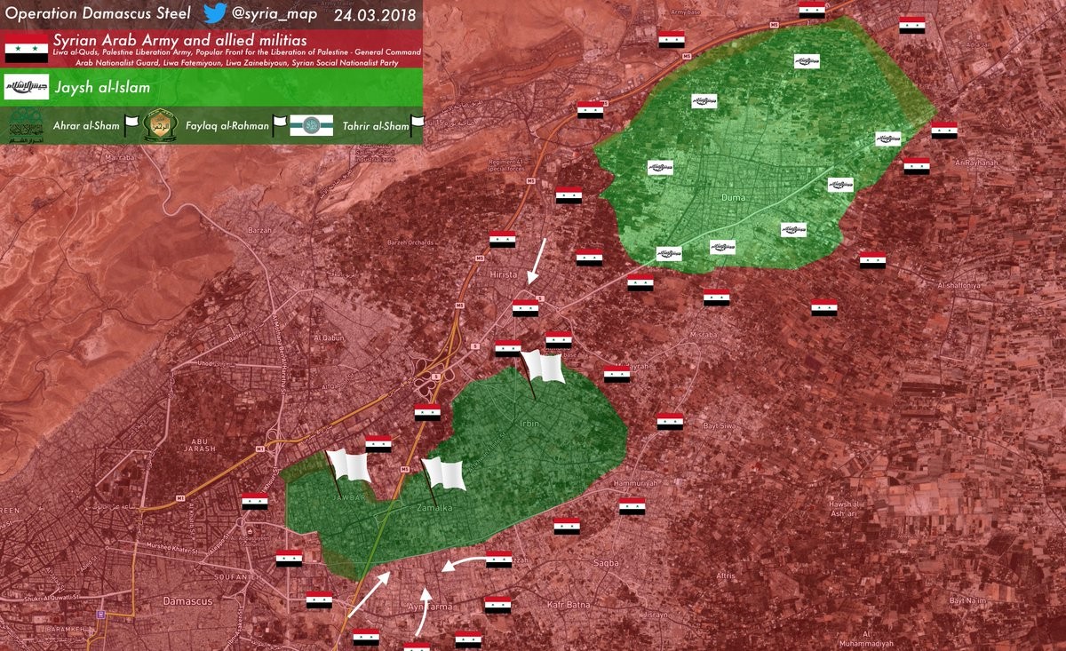 12.35 По сообщениям, распространяемым в социальных сетях, армия Сирии захватила одного из командиров группировки Файлак-ар-Рахман в Восточной Гуте. Предположительно, в плен военных попал Абдель Нассер Шмейир, один из главарей группировки в данном районе.