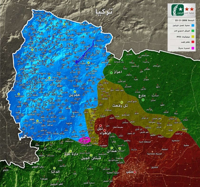 ВС Турции и боевики «Сирийской свободной армии» взяли под полный контроль город Африн. Сирийская армия продвигается в Восточной Гуте. Боевики «Ахрар аш-Шам» согласились сдать свои позиции в городе Хараста и уехать в провинцию Идлиб. Боевики продолжают тяжелые и массированные обстрелы Дамаска.