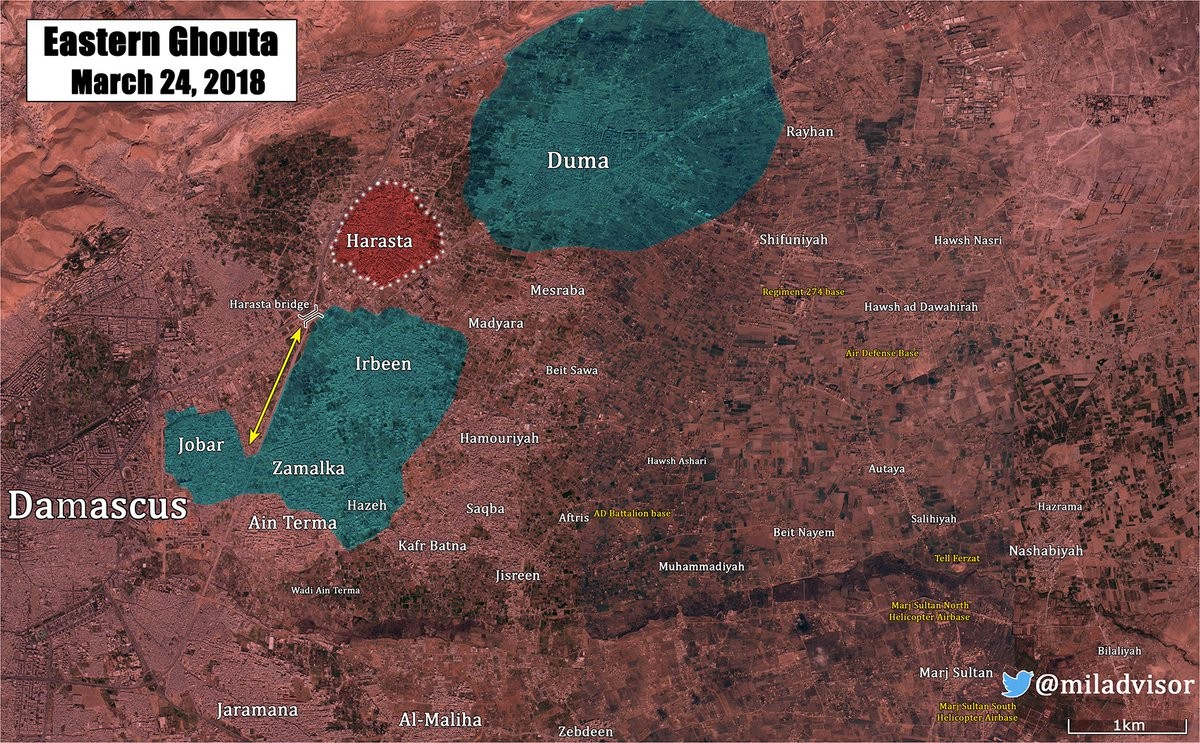14.40 Трасса в сирийской Харасте возобновляет работу впервые за шесть лет. В настоящий момент, военные сирийской армии восстанавливают мост Харасты, для организации вывода боевиков из городов Джобар, Замалька, Хараста и Айн-Терма в Идлиб по данному маршруту.