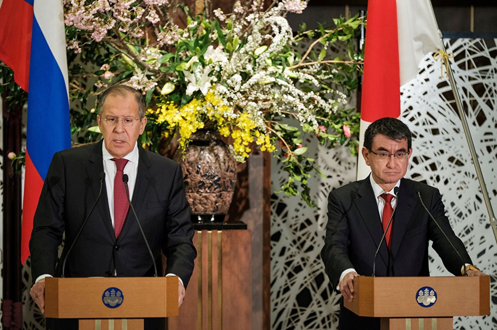 Министр иностранных дел России Сергей Лавров и министр иностранных дел Японии Таро Коно во время пресс-конференции в Токио. 21 марта 2018
