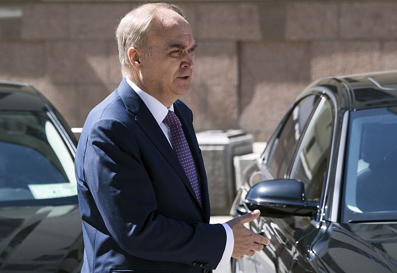 фото посла Анатолия Антонова, смотрящего на самолёт с дипломатами со сложенными за спиной руками.