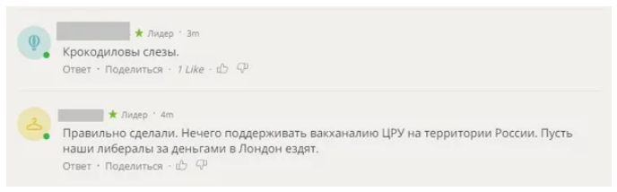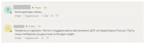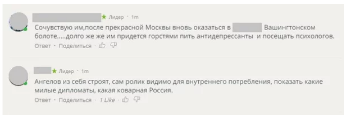 Один из комментаторов написал, что дипломаты США льют «крокодиловы слезы». Другой поддержал действия Кремля, отметив, что дипломаты США, по сути, это наверняка сотрудники ЦРУ, и не стоит им позволять вести деятельность внутри страны.
