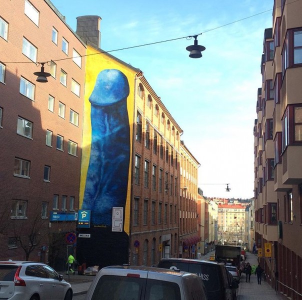 Граффити шведской уличной художницы Каролины Фалкхольт являет собой изображение синего пениса. Рисунок растянулся на всю высоту пятиэтажного дома.