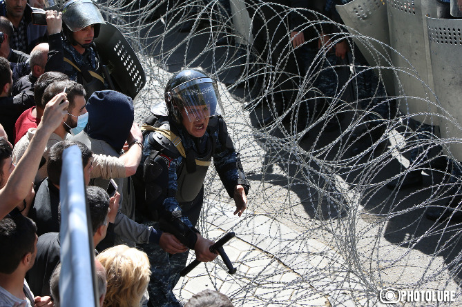 С сегодняшнего утра парализовано движение транспорта по всему центру Еревана - настоящий транспортный коллапс. Закрыта станция "Маршал Баграмян", перекрыто движение на станциях "Еритасардакан" и "Площадь Республики". Сорваны занятия в ряде учебных заведений. Радикалы во главе с Пашиняном ворвались в Ереванский педагогический университет, избив пытавшихся оказать им сопротивление студентов. Также они ворвались в здание Государственного медицинского колледжа. Произошли ожесточённые столкновения между протестующими и стражами правопорядка на проспекте Баграмяна, где находятся парламент и резиденция главы государства. Около полусотни раненых, в том числе сам вожак Пашинян. Он получил травмы рук и гематому на лице, и был доставлен на полицейской машине в больницу; после перевязки Пашинян вновь замечен в авангарде бунта. Некоторые полицейские получили ранения тупыми и режущими предметами, один из них экстренно прооперирован - у него повреждены вены и частично задета артерия. Основные административные здания защищает живая стена правоохранителей, натянута колючая проволока.
