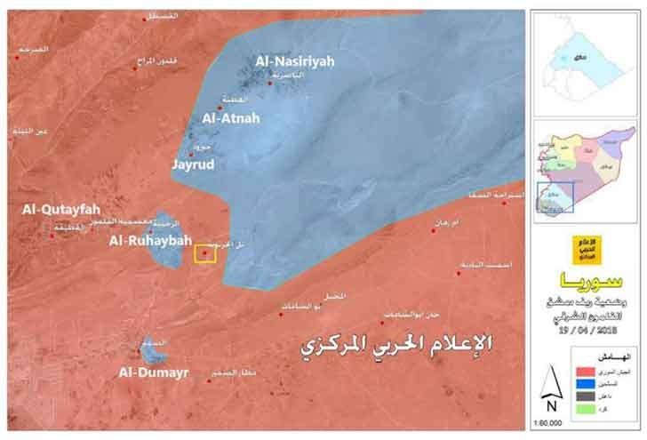 Выдвинувшаяся их этого района штурмовая группа «Аль-Насер», возглавляемая офицером Юнесом Хассаки, заняла фермы вокруг города Аль-Рухайба, окружив группировку «Джейш Тахрир аль-Шам», в этом населенном пункте, которая ранее отказалась примириться с правительством. Оказавшись в безвыходном положении, боевики начали сдаваться в плен.