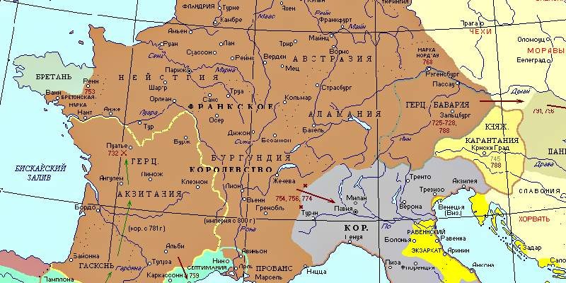 Фактически же эти земли были разделены на Австразию (ныне северо-восточная Франция, Бенилюкс и северо-западная Германия), Нейстрию (ныне центральная и северо-западная Франция) и несколько больших и могущественных земель: Бургундия, Аквитания, Прованс, Гасконь. Их правители яростно воевали друг с другом и прочими соседями.