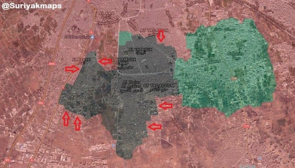 Также сообщается, что отряды САА при поддержке сирийско-палестинского ополчения продвинулись в район Хаджар аль-Асвад с юга, уничтожив несколько десятков террористов Исламского государства.