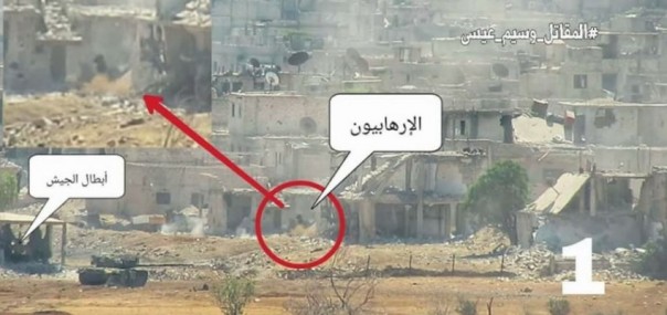 На снимках запечатлены городские бои — танк правительственных сил столкнулся с сопротивлением боевиков ИГ* в аль-Кадаме. Экстремисты вышли из тоннеля под одним из зданий и были обнаружены экипажем танка, который прямым выстрелом ликвидировал террористов.