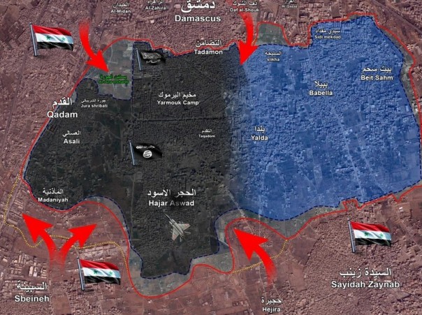 На юге Дамаска САА успешно продвигается на направлениях Аль-Мазиния, Аль-Джура, Аль-Асали и Хаджар Аль-Асвад. Разгромлены укреплённые позиции ДАИШ, террористы несут большие потери