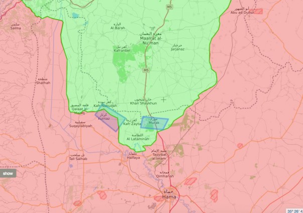 Сирийский телеканал Al-Ikhhbaria обнародовал кадры артилерийского удара САА по позициям боевиков в городе Мурак на севере Хамы – близко к месту дислокации турецких военных наблюдателей. Прямым попаданием было уничтожено по меньшей мере три транспортных средства террористов.