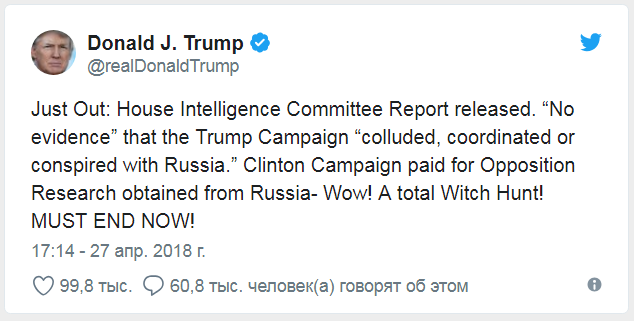 «Отчёт комитета по разведке только что вышел. «Никаких свидетельств», что кампания Трампа «вступила в сговор, координировалась или действовала сообща с Россией». Кампания Клинтон заплатила за компромат, полученный из России — вау! Тотальная охота на ведьм! Должна закончиться сейчас!» — такого содержания твит появился в аккаунте Трампа в Twitter.