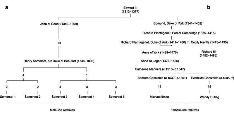 У Ричарда III не осталось прямых потомков, однако возможности для сравнения были. Начать решили с мужской Y-хромосомы, передаваемой от отца к сыну. Специалисты нашли пять потомков Генри Сомерсета — 5-го герцога Бофорта (1744-1805), который был дальним потомком Эдуарда III. Ричард III приходился Эдуарду III праправнуком, а значит у всех у них должна была совпасть половая хромосома.