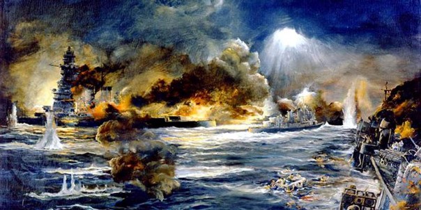 У американцев нашлись два тяжёлых крейсера, три лёгких и восемь эсминцев. У Абэ в дополнение к линкорам имелся крейсер «Нагара» и одиннадцать эсминцев. Итого 14, да и вообще японцы в «чёртову дюжину» не верили, а вот у американцев народ приуныл.