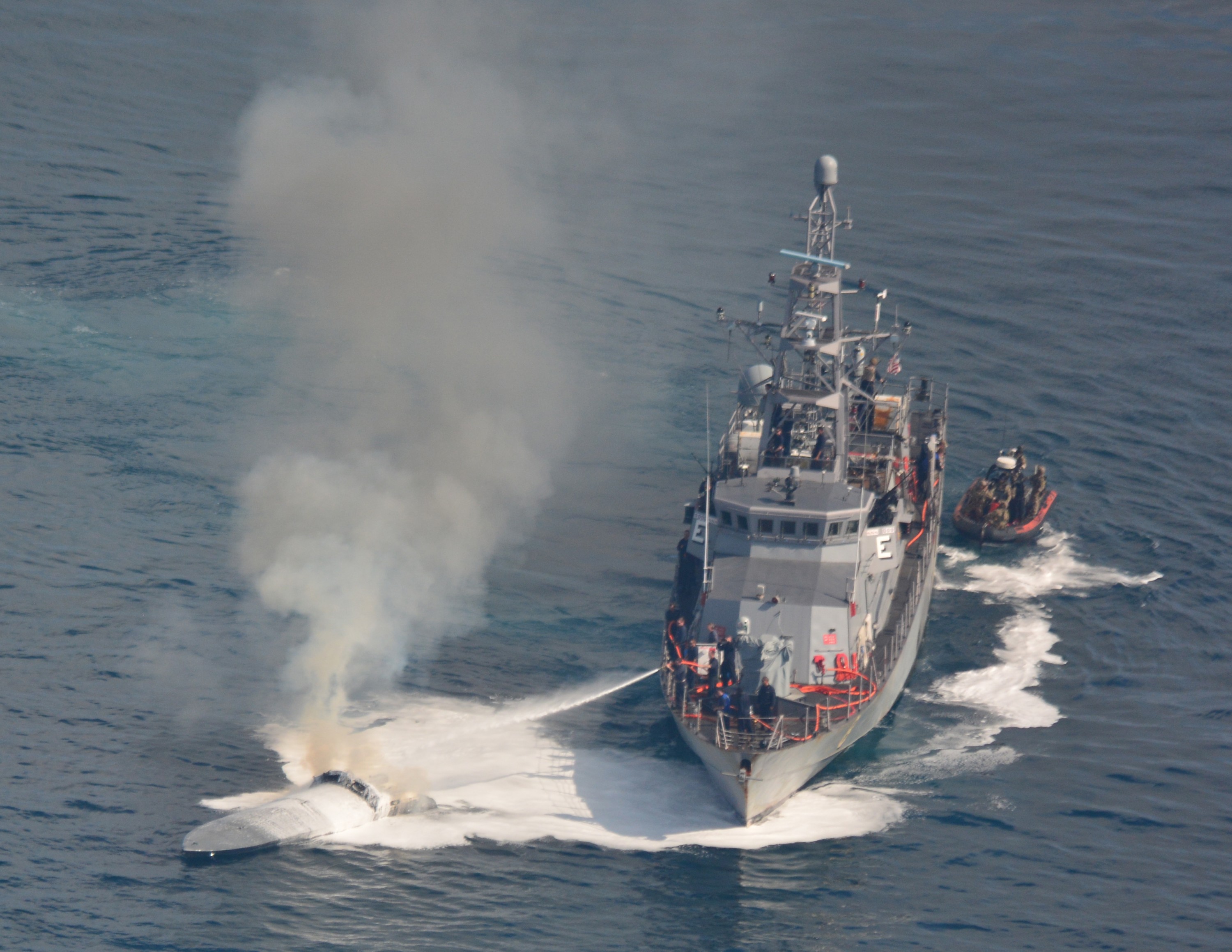 Сторожевой катер РС 8 Zephyr ВМС США осуществляет тушение пожара на перехваченном подожженом малозаметном скоростном катере колумбийских наркоторговцев, 07.04.2018 (с) Таможенная и пограничная служба США