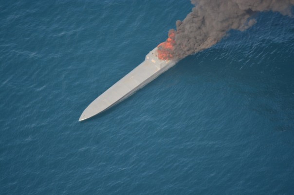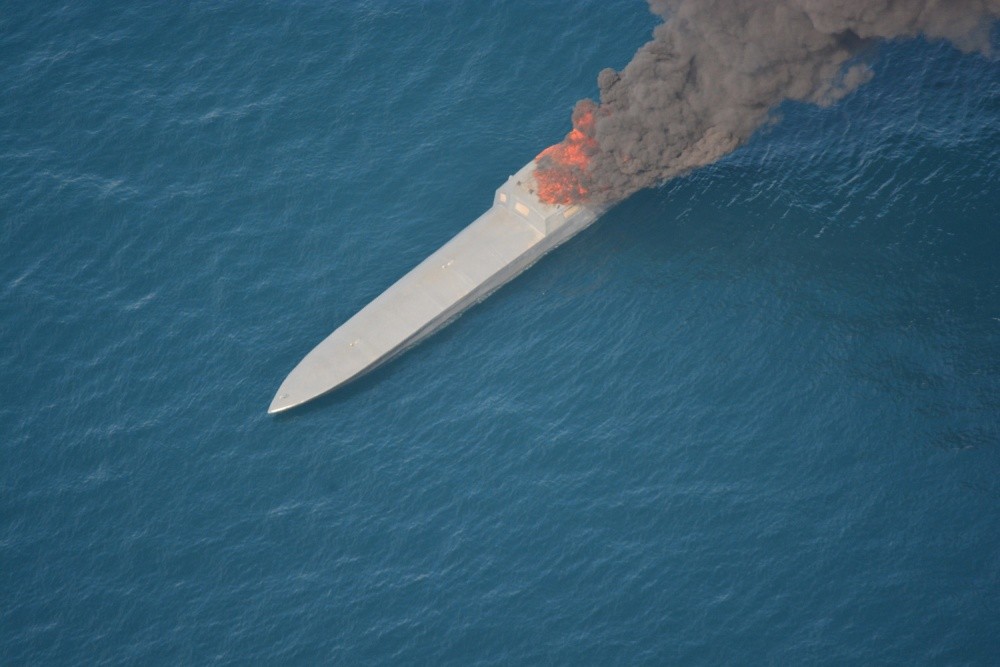 Горящий подожженый малозаметный скоростной катер колумбийских наркоторговцев, 07.04.2018 (с) Таможенная и пограничная служба США