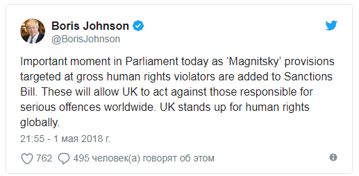 Представители правительства Великобритании отрицают, что закон направлен на противодействие именно российским гражданам. Однако то, что он принят в период обострения двусторонних отношений в связи с «делом Скрипалей», не учитывать нельзя. Перенявший стиль американского президента министр иностранных дел страны Борис Джонсон опубликовал торжественный пост в Twitter-аккаунте: