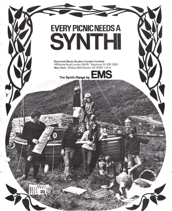 «Ни один пикник не может обойтись без SYNTHI» - реклама синтезатора SYNTHI производства студии EMS. В этой рекламе снялись Питер Зиновьев (стоит в килте с клавиатурой DK1), его жена Виктория (сидит) и трое их детей
