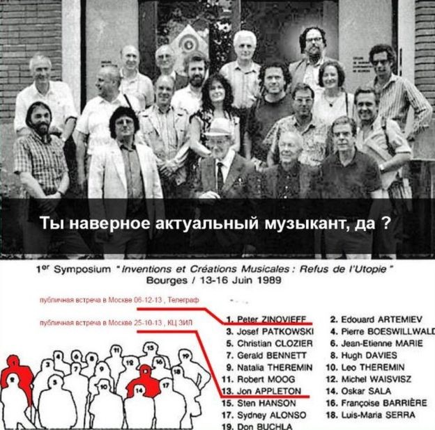 Участники симпозиума «Изобретения и музыкальное творчество: отказ от Утопии» во французском городе Бурж в июне 1989 г. Среди них - Питер Зиновьев, советский композитор электронной музыки Эдуард Артемьев, изобретатель знаменитого синтезатора Moog Роберт Муг и патриарх электроники легендарный изобретатель термин-вокса Лев Термен