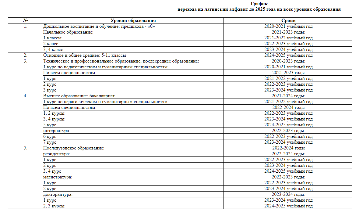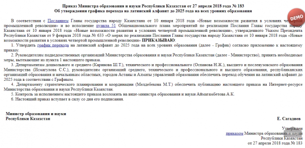 Приказом министра образования и науки РК Ерлана Сагадиева от 27 апреля 2018 года утвержден график перехода на латинский алфавит до 2025 года на всех уровнях образования, сообщает Kazpravda.kz.