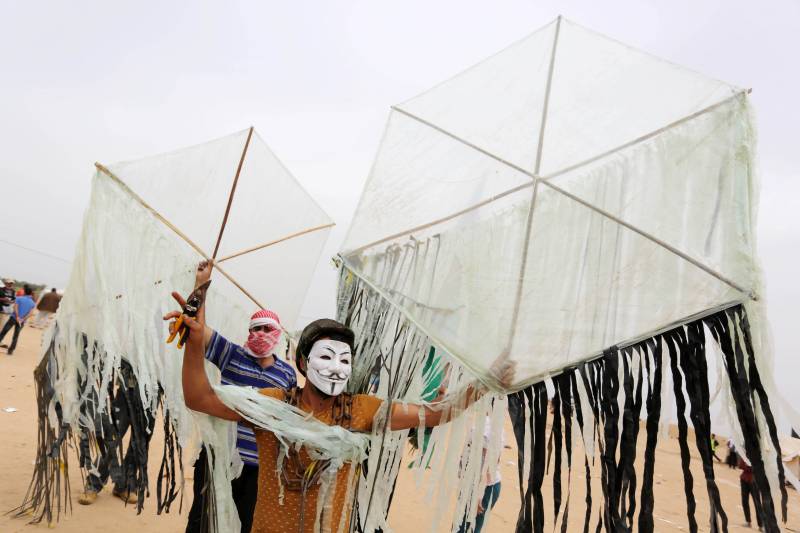На фото палестинцы запускают воздушных змеев-зажигательные снаряды в сторону Израиля с целью вызвать там пожары. Без разницы где конкретно. Хоть в парках, хоть в жилых кварталах, хоть в детских садах, больницах или школах. На кого Аллах пошлет!