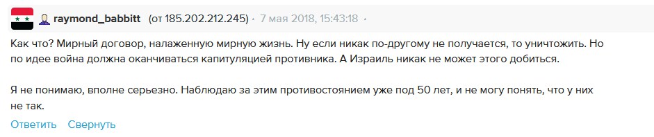 Толку это не дает никакого. У каждой стороны своя правда. Арабы гордятся тем, что "все равно демонстрируют несгибаемость своей воли и готовность любыми, даже такими вот способами, наносить удары по врагу". ЦАХАЛ не менее обоснованно настаивает на законности своего права защищать государство и граждан от атак, имеющих все неоспоримые признаки откровенного терроризма. Сама геополитическая проблема эту войну вызывающая, по прежнему остается нерешенной. А значит все это будет повторяться и повторяться.