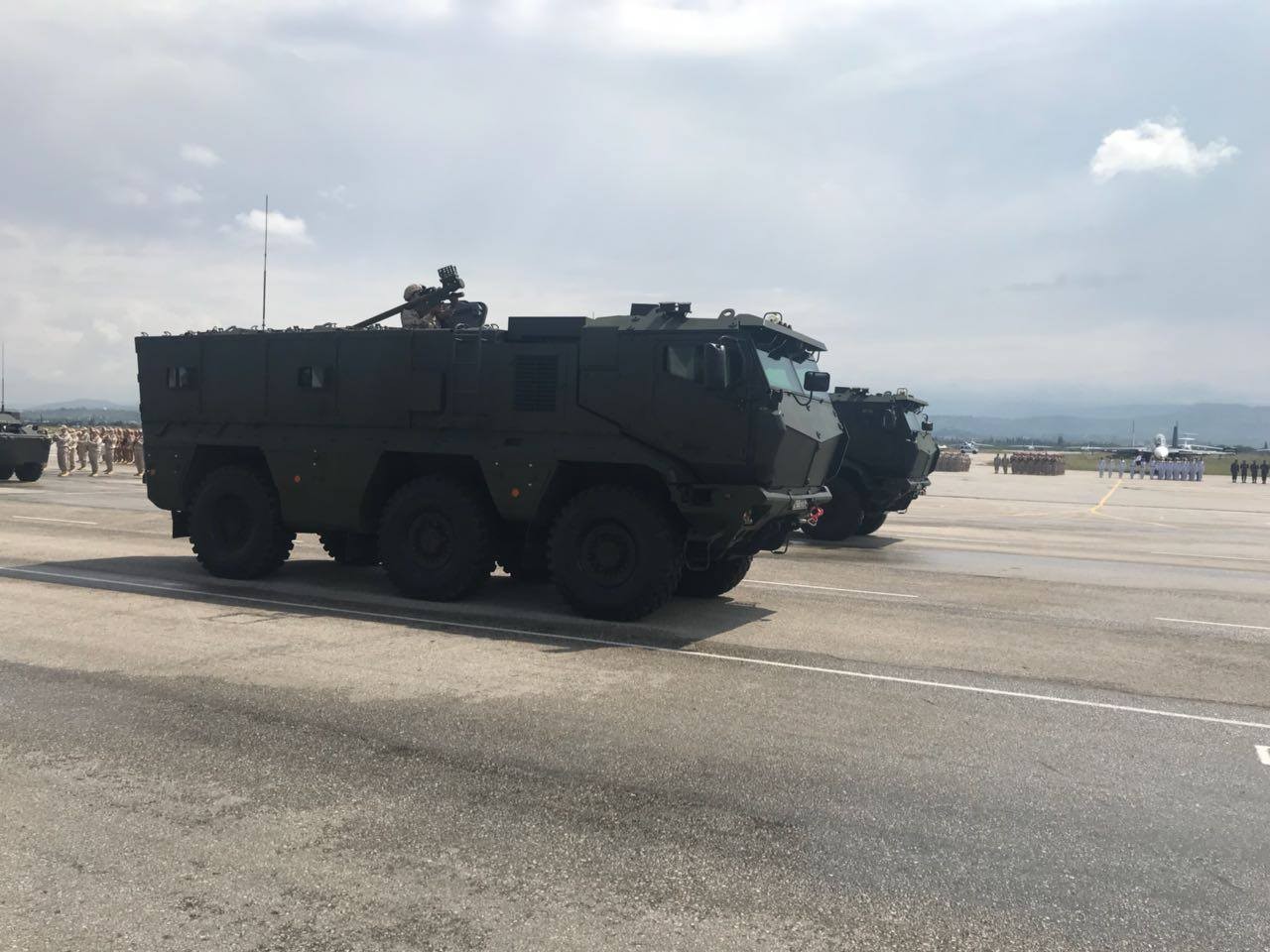В составе механизированной колонны прошли современные образцы российской военной техники, среди которых бронеавтомобили «Тайфун», «Тигр», БТР-82АМ и другие образцы военной техники стоящие на вооружении.