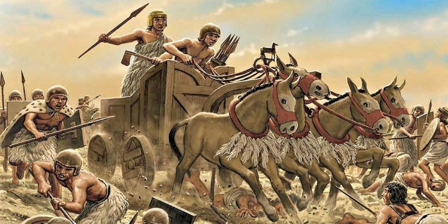 Их армии состояли из трёх видов войск. Знать воевала на… колымагах. Иначе эти протоколесницы не назвать. Они представляли собой запряжённые четвёркой ослов повозки с высокими бортами и на четырёх небольших колёсах, вырезанных из цельных кусков дерева. Двигалась эта машина смерти со скоростью до 25 километров в час. Сидевшие в ней воины-аристократы кидали во врагов дротики, сражались длинными копьями и боевыми топорами.