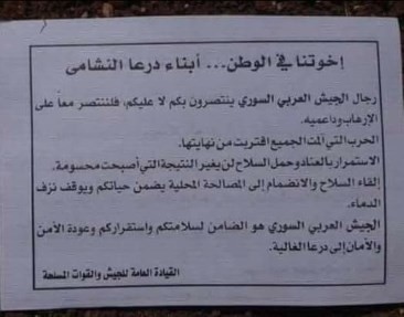 09.00 ВВС Сирии осуществили пропагандистский рейд на территорию южной провинции Дераа. В ходе налета, на позиции боевиков в данном районе были сброшены листовки с призывами сложить оружие и сдать позиции правительственным силам. Предполагается, что наступление САА в данном районе начнется после того, как будет ликвидирован анклав боевиков в Ярмуке, южнее Дамаска.