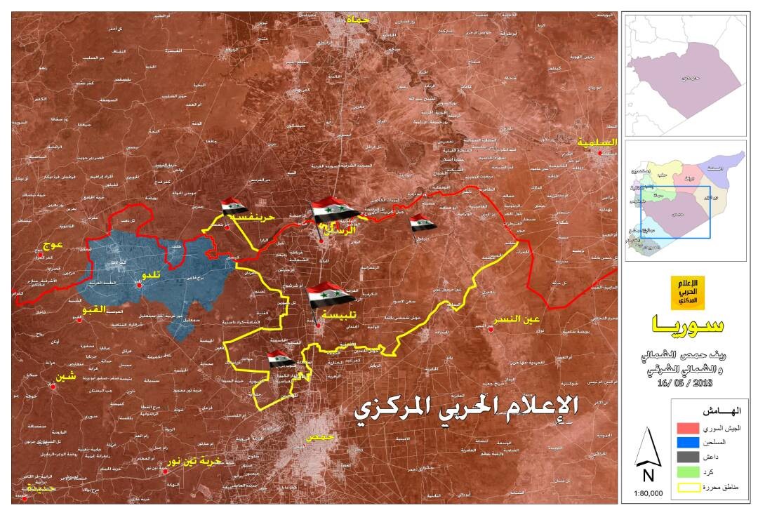 Сирийская армия при взаимодействии с союзниками завершает очистку 1200 кв. км на севере провинции Хомс и юге провинции Хама. Восстанавливается безопасность от террористических организаций в 65 населенных пунктах.