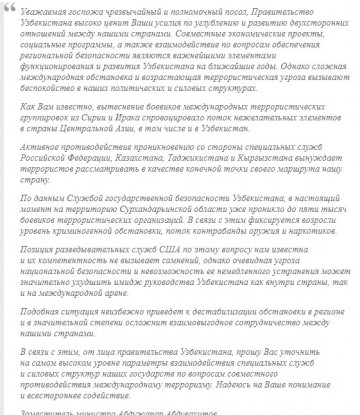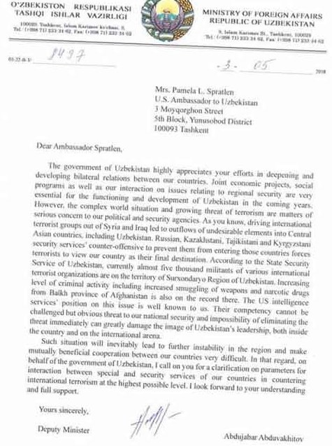 В этом месяце в Сеть просочилась информация о том, что огромное количество боевиков ИГ проникла на территорию Республики Узбекистан из Сирии, Ирака и Афганистана. Эти сведения подтверждаются копией официального письма МИД этой страны в адрес посольства США. В данном документе, датированном 3 мая 2018 года, чиновники Узбекистана выражают обеспокоенность появлением значительного количества террористов.