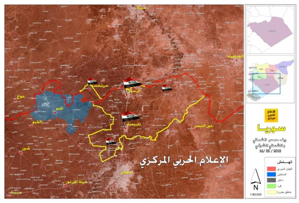 14.30 Пресс-служба армии Сирии заявила о полном взятии под контроль «Растанского анклава». Общая площадь территорий, занятых военными составляет 1200км2. Ранее, исламисты оставили данный район, передав военным оружие и бронетехнику. В ближайшее время в данном районе заработают правительственные учреждения.
