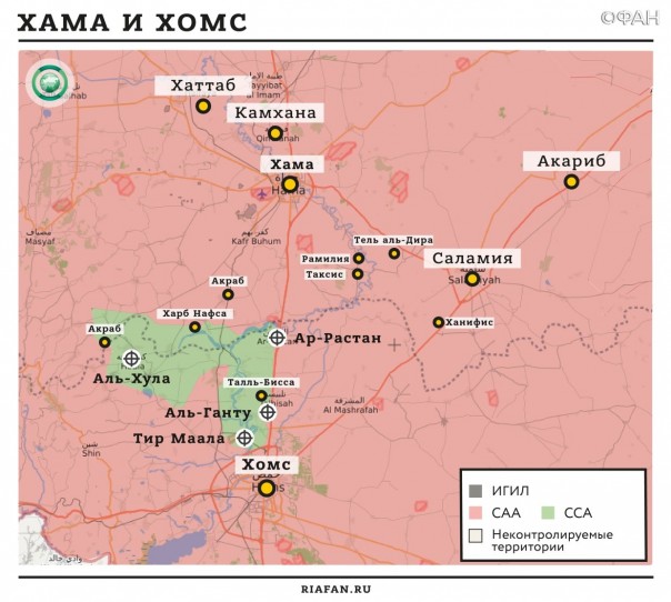 13.15 Армия Сирии занимает восточные районы «Растанского анклава». Согласно сообщениям проправительственных источников, под контроль военных перешли два главных оплота джихадистов в данном районе- Ар-Растан и Тельбиса. «Умеренная оппозиция» все еще контролирует западную часть анклава, ожидая вывода на север страны.