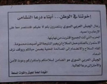 15.15 По информации местных СМИ, сирийская армия выдвинула ультиматум боевикам, контролирующим город Дераа и другие территории одноименной провинции. По имеющимся данным, правительство требует от боевиков начать процесс сдачи своих позиций армии Сирии в течении ближайших 48 часов. Предполагается также, что в противном случае в Дераа будут переброшены части 3-й дивизии САА, дивизия «Тигр» и другие формирования, участвовавшие в осаде «Растанского анклава».