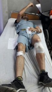 Он был одет в госпитальную зеленого цвта врачебную форму. «Рядом с нами не было никакого дыма, с израильской стороны не раздавалось ни до, ни после никаких выстрелов. В зоне видимости не было и демонстрантов. Я услышал громкий хлопок и оказался на земле», — пишет врач.