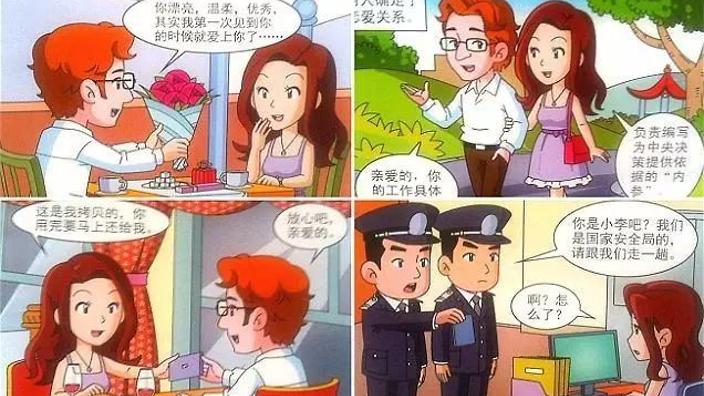 В апреле 2016 года в Китае появились плакаты с изображением комикса «Опасная любовь» (Weixiande aiqing), в котором рассказывалось о том, как рыжеволосый иностранец соблазнил государственную служащую Сяо Ли, которая передала своему возлюбленному секретные данные. После задержания девушка, рыдая, объясняла сотрудникам органов безопасности: «Я не знала, что он шпион, он меня использовал!». Этот комикс был приурочен к первому Дню образования в сфере национальной безопасности и сейчас многие считают, что как раз с этого в Китае началась масштабная кампания по выявлению иностранных шпионов.