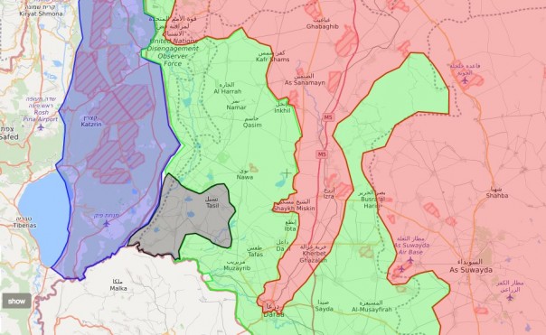 На данный момент в Дараа возобновились бои между FSA и группировкой ИГ* — столкновения зафиксированы в окрестностях прифронтовых населенных пунктов Джиллен и Аш-Шейх Саад. Столкновения между боевиками происходят уже несколько лет, однако принципиально в Дараа ничего не меняется — линия разграничения между ИГИЛ* и FSA проходит по реке Ярмук.