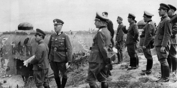Немецкие и японские офицеры осматривают захваченные укрепления