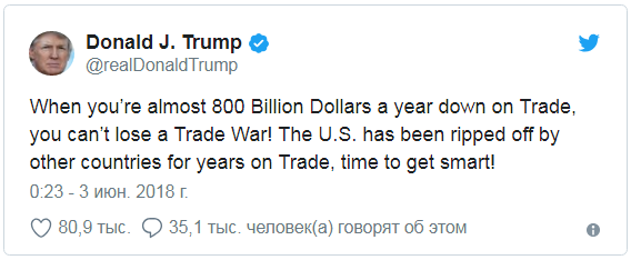 "Когда ваш внешнеторговый дефицит составляет почти 800 миллиардов долларов в год, вы не можете позволить себе потерпеть поражение в торговой войне!", − указал американский лидер.