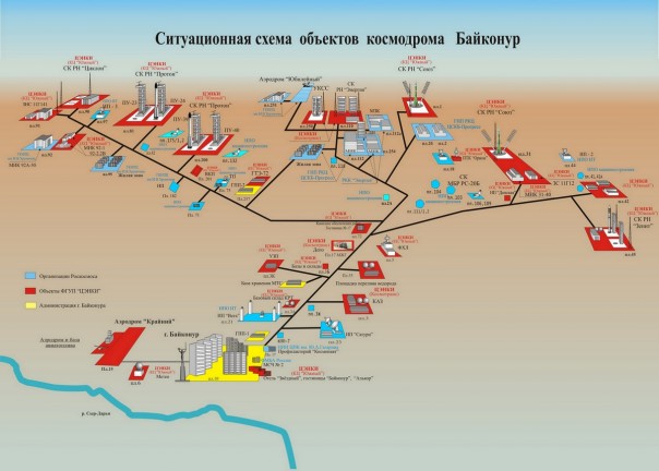 В настоящее время Россия арендует у Казахстана город Байконур и одноименный космодром. Общая площадь территории арендованных земель составляет 6717 кв км. Сюда входит девять типов стартовых комплексов (пять действующих) в составе 15 пусковых установок (из них 5 действующих — две под ракеты "Союз", две под ракеты "Протон" и один "старт" под "Зенит") для запуска ракет-носителей, четыре пусковых установки для испытаний межконтинентальных баллистических ракет, кислородно-азотный завод, два аэродрома, большое количество технических корпусов.