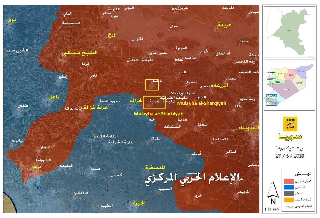 13.40 Армия Сирии продолжает наступать в Дераа. Части 5-й дивизии и дивизии «Тигры» успешно выбили противника из населенных пунктов Малиха-аль-Гарбия, Малиха-аль-Шаркия и бывшую базу 52 бригады, а также небольшой город Ракхам. В настоящий момент, вооруженные силы намерены окружить крупный оплот противника в данном регионе- город аль-Карак и вынудить противника отступить.