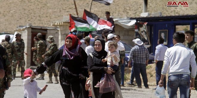 Корреспондент агентства САНА сообщил, что из ливанского района Эрсаль на КПП прибыло около 450 человек, затем они на автобусах будут перевезены в свои селения в Западном и Восточном Каламуне.