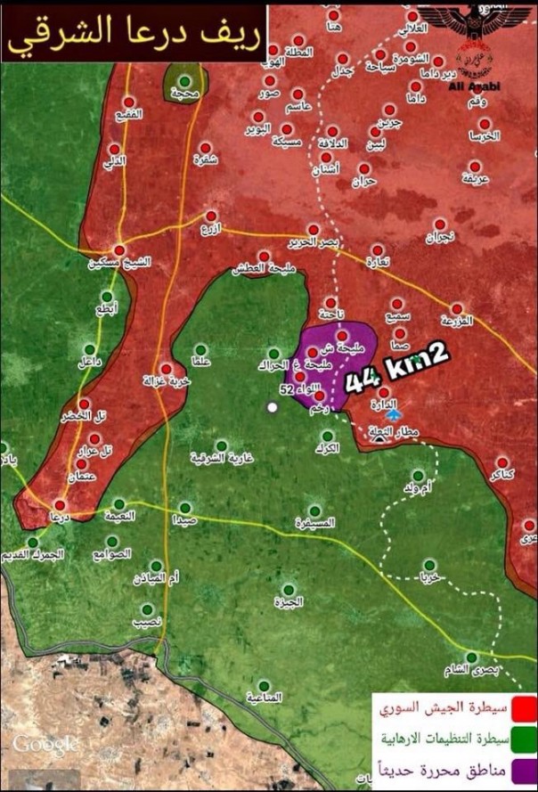 Ранее сегодня САА пошла в наступление на контролируемую джихадистами военную базу 52 бригады в восточной Дараа. Во главе с подразделениями “Силы Тигра” после короткого сражения сирийская армия по освободила базу. После этого правительственные силы продвинулись на юг к контролируемому боевиками городу Рахам. По словам местных источников Рахам также удалось освободить, и вынудить боевиков отступить к аль-Караку.