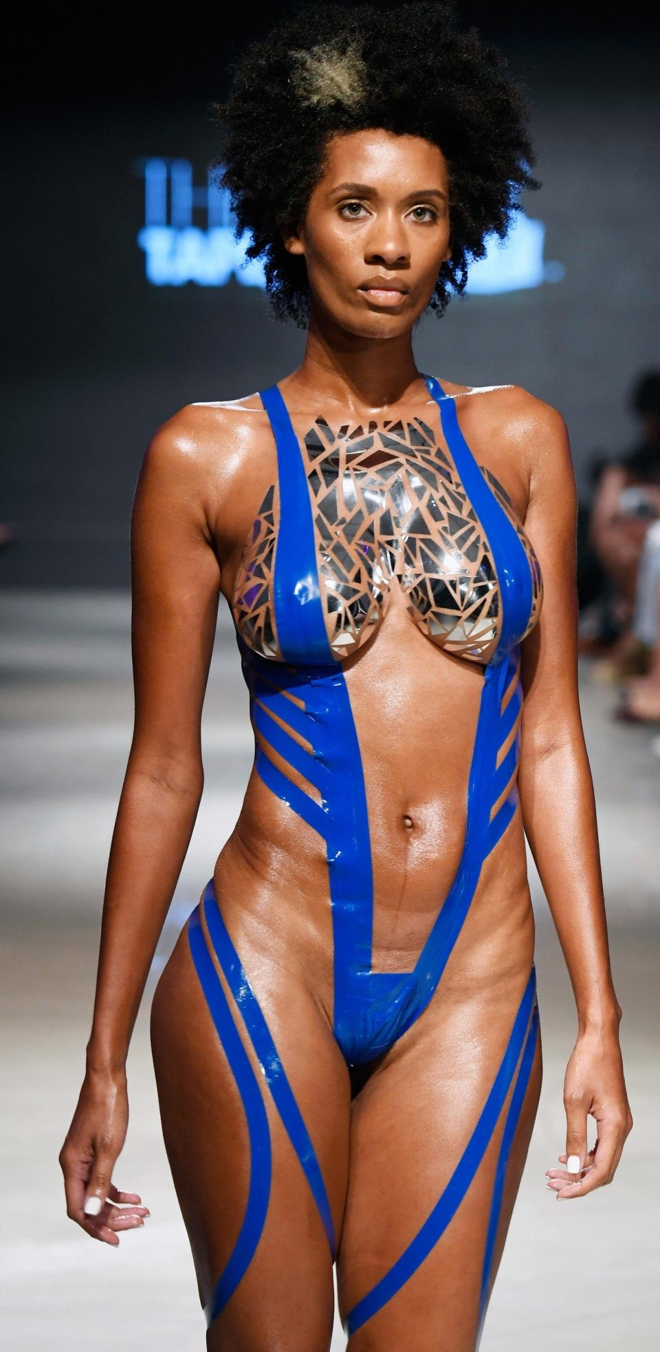 На показе Miami Swim Week во Флориде были представлены купальники "нового поколения" – из разноцветных полосок изоленты, наклеенных непосредственно на тело.