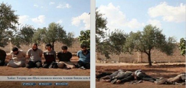 13.37 Сирия, провинция Идлиб — Боевики «Хейят Тахрир аш-Шам»* (бывшая «Джабхат ан-Нусра»*, филиал «Аль-Каиды»*) казнили 8 боевиков «Исламского Государства»*, которые были пойманы несколькими днями ранее, в результате нескольких контртеррористических операций, на подконтрольных «умеренной оппозиции» территориях в сирийской провинции Идлиб.