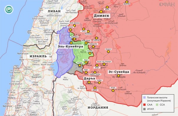 В настоящий момент, сирийская армия занимает холмы, расположенные в непосредственной близости от спорной территории Голанских высот. Как только эта миссия будет выполнена начнется сражение с ИГИЛ*, которая располагается между сирийско-израильской и сирийско-иорданской границей. Источник