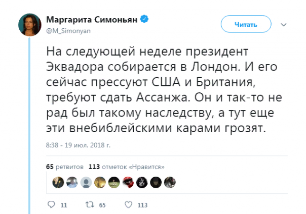 Кроме того, Симоньян написала, что президент Эквадора на следующей неделе планирует поездку в Великобританию.