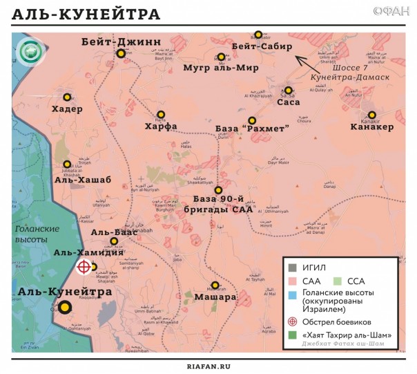 Сирийская арабская армия (САА) и союзные силы: уничтожили боевиков «Ан-Нусры», попытавшихся атаковать САА на западе Алеппо; обнаружили цех по производству СВУ в провинции Эль-Кунейтра.