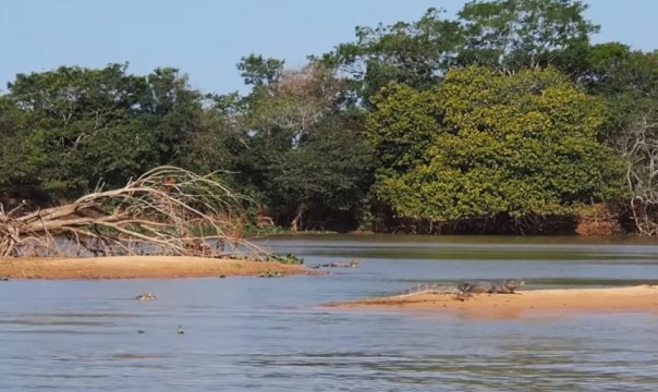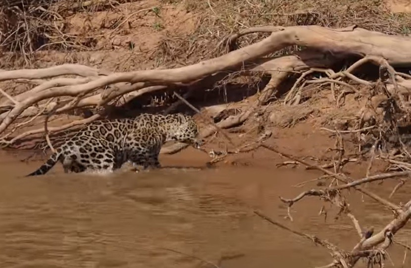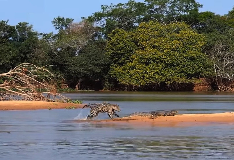 Пару лет назад экологу в Бразилии удалось снять на видео нападение ягуара на каймана. Незаметно подкравшись к рептилии, хищник настигает её одним быстрым броском.