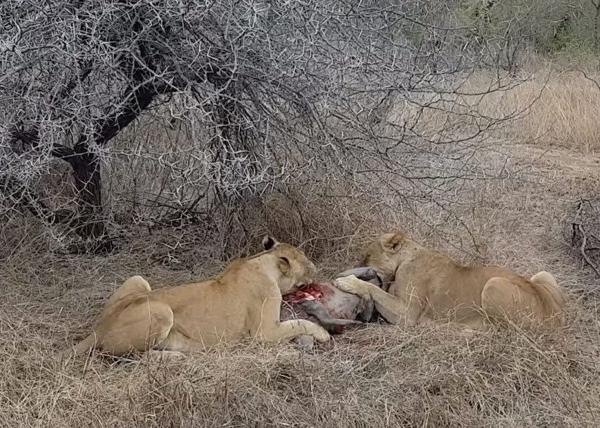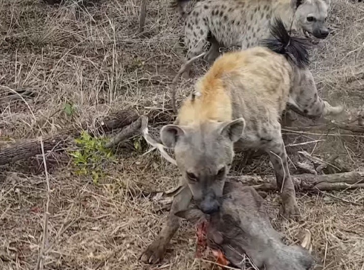 Одна львица своевременно оценила опасность и ретировалась незамедлительно, а другая немного замешкалась и покинула место сражения с потерями — ее несколько раз покусали (а ведь челюсти гиен считаются одними из самых мощных среди хищников). Победителям же осталась туша бородавочника, которую те торжествующе бросились делить и разорвали в считанные минуты. Источник